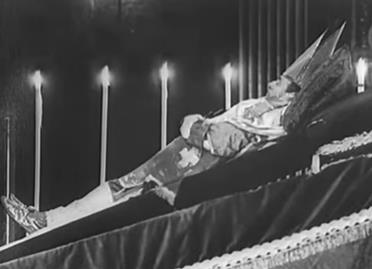 * Trei sicrie erau aşezate în mijlocul bisericii. Primul, în lemn de chiparos, căptuşit cu mătase roşie, al doilea de plumb de 4 mm grosime şi care cântărea patru chintale. Pe capacul sicriului, un cap de mort cu două oase încrucişate, armele papei, o lungă inscripţie cu date biografice. Al treilea scriu, în lemn de ulm, cu embleme şi inscripţii de bronz pe capac.